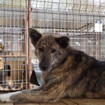 Diese hübsche gestromte Hündin mit den weißen Pfötchen ist unsere Carpe. Sie hat sich gut an den Alltag im Shelter gewöhnt. Carpe ist ungefähr 2015 geboren und etwa 50 cm groß